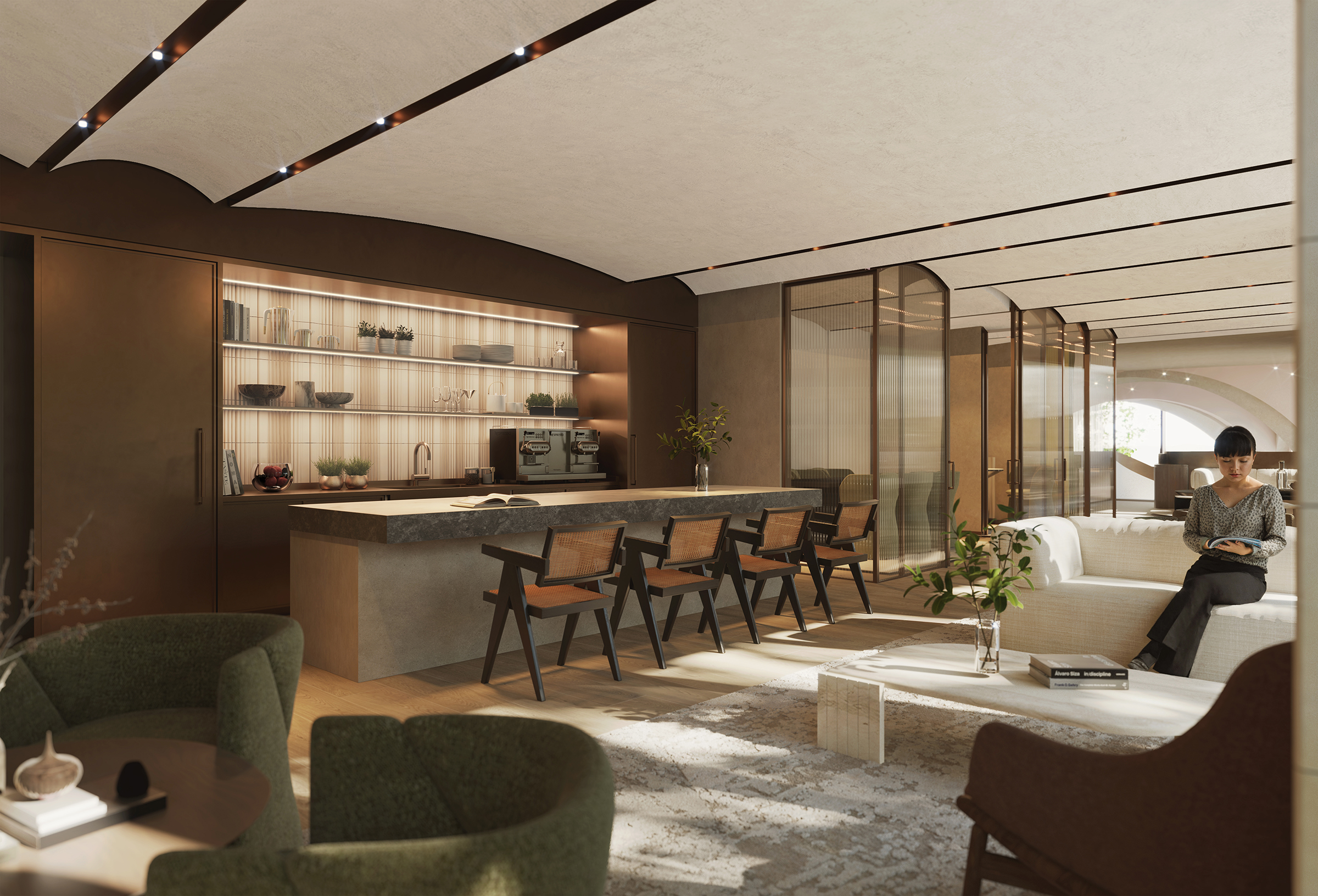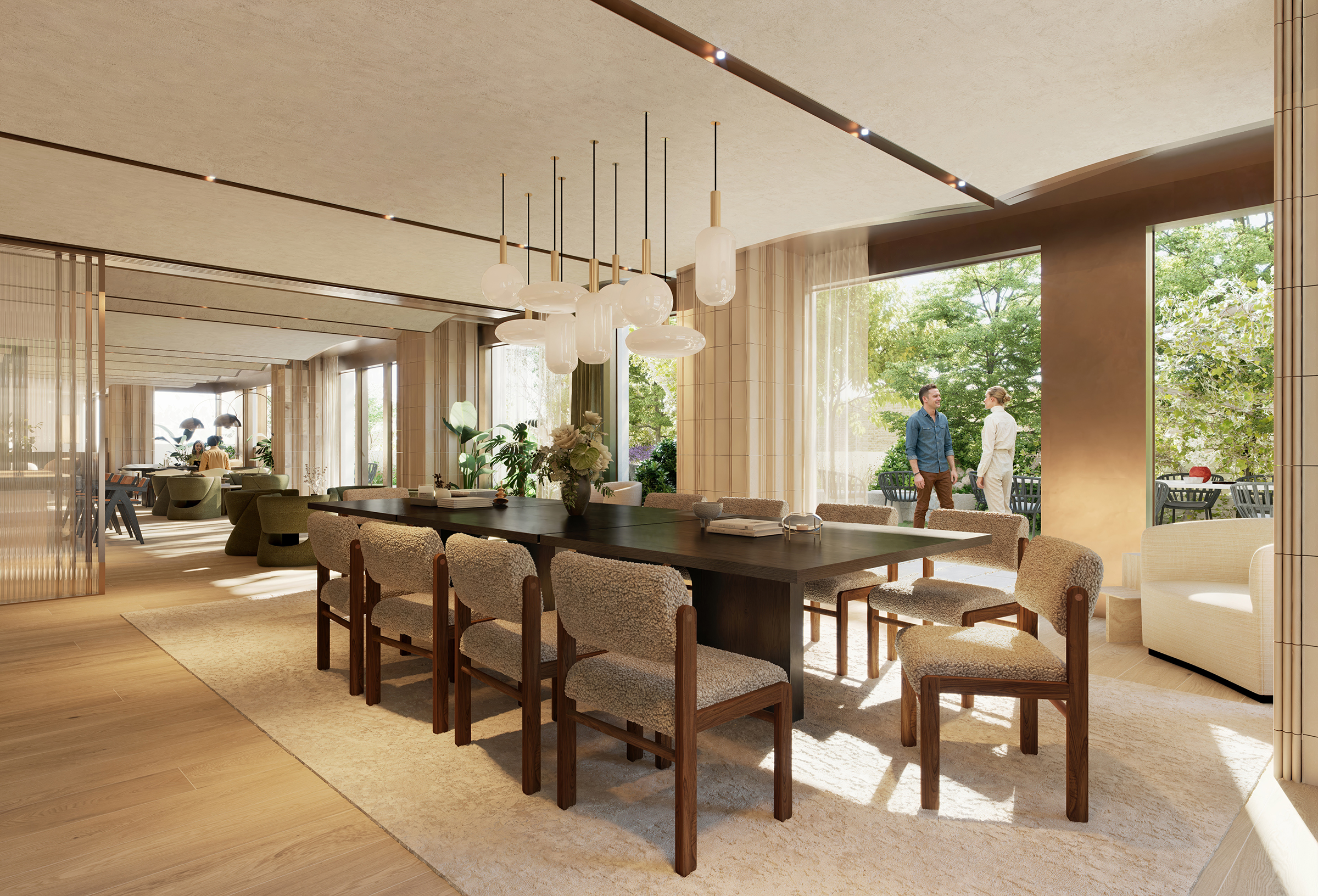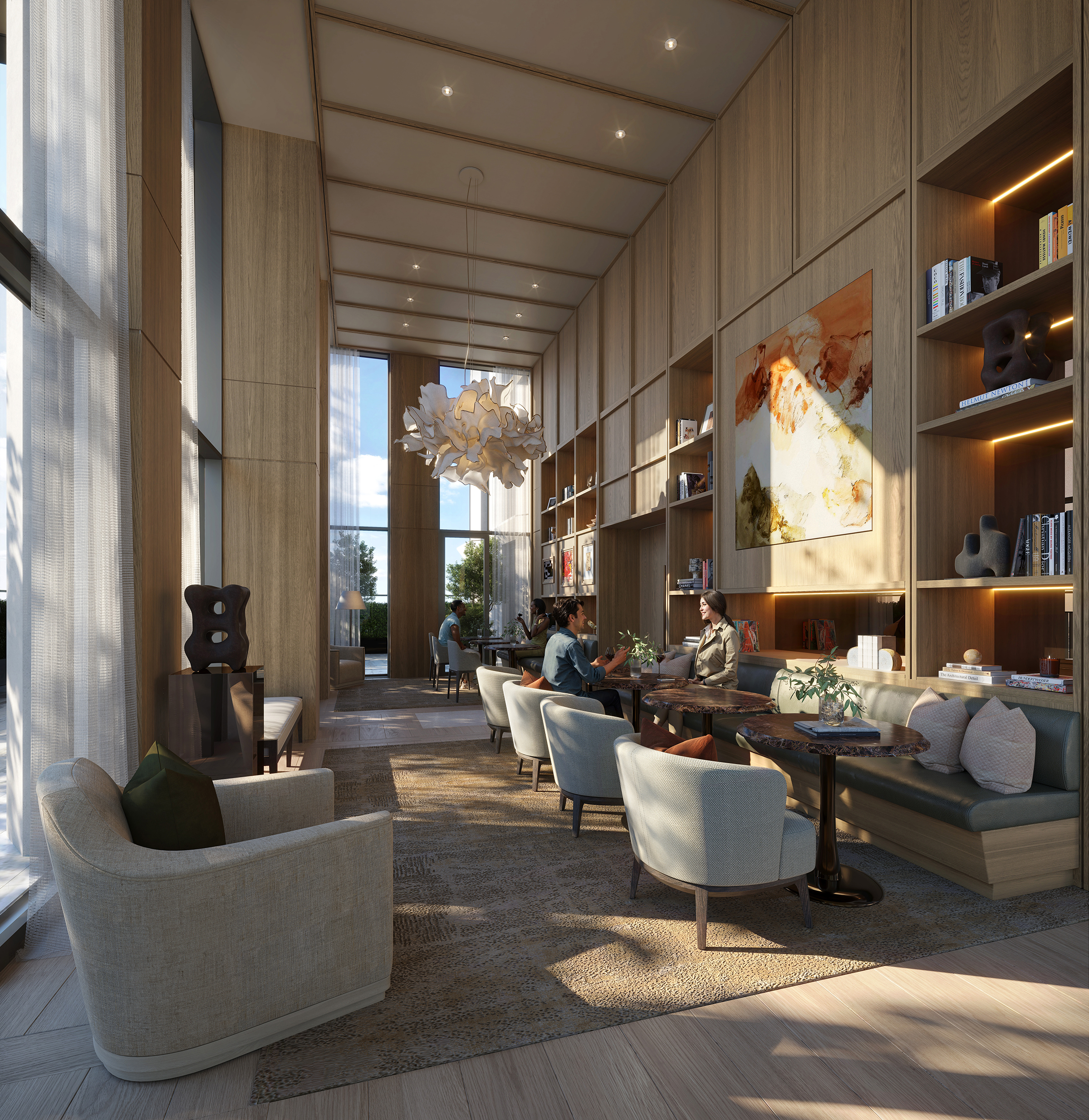 The guest lounge will be a warm and inviting space where visitors can relax in comfort while enjoying the exceptional amenities of Opus.