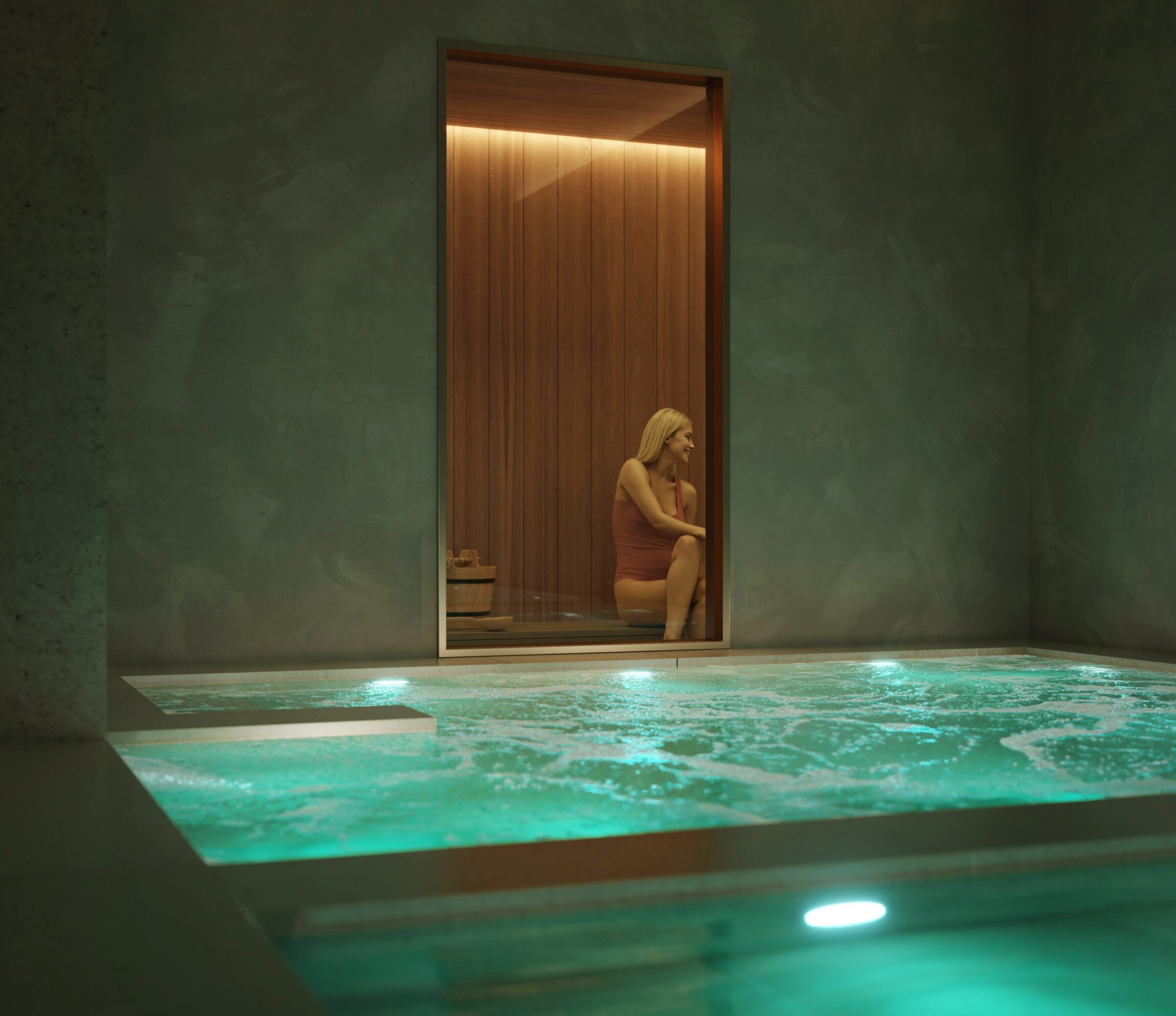 The calming ambiance of the sauna will provide an immersive escape for residents at Opus, with soothing heat that melts away tension, eases muscle soreness and promotes mental clarity.